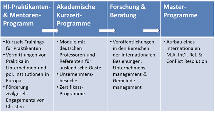 Dabei besteht das Kerngeschäft des Institutes im Aufbau der Master-Programme. Master-Programme werden zunächst den Bachelor-Programmen vorgezogen, weil sie nicht so kostenintensiv sind und hier zunächst durch christliche Hochschulabsolventen ein größerer Markt existiert. Aufgrund unserer Beiratszusammensetzung aus einem Diplomaten, zwei Politikwissenschaftlern für internationale Politik und vergleichende Politikwissenschaften und vieler weiterer Kontakte macht es für uns zunächst Sinn, auch in diesem Bereich ein Master-Programm anzubieten.